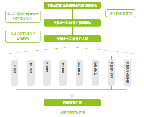 中铝公司总部及实体企业都设有职业健康安全和环境委员会,公司及企业法定代表人是环境保护管理的第一责任人。我们实行生产与环保统一管理、统一检查、统一考核,建立健全环境保护岗位责任制,形成全面、全员、全过程的环境保护管理体系。2013年,公司ISO14000环境管理体系有效运行。